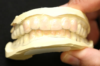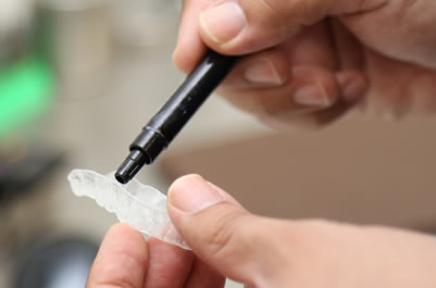 マウストレーの装着 - ホワイトニングジェルの入ったマウストレーを歯に装着します。
