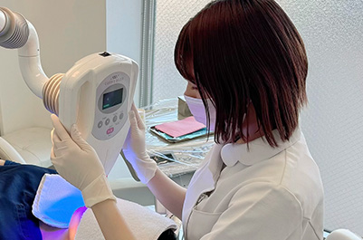 - 光を10分×3回照射を行います。光照射が終わったら、ホワイトニングジェルをふき取ります。